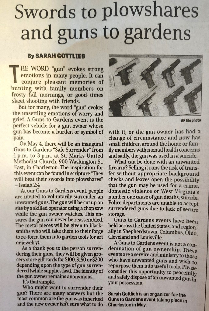 One of the organizers for Charleston Guns 2 Garden is Sarah Gottlieb and she wrote this piece that was published in the Gazette-Mail, March 30, 2024: